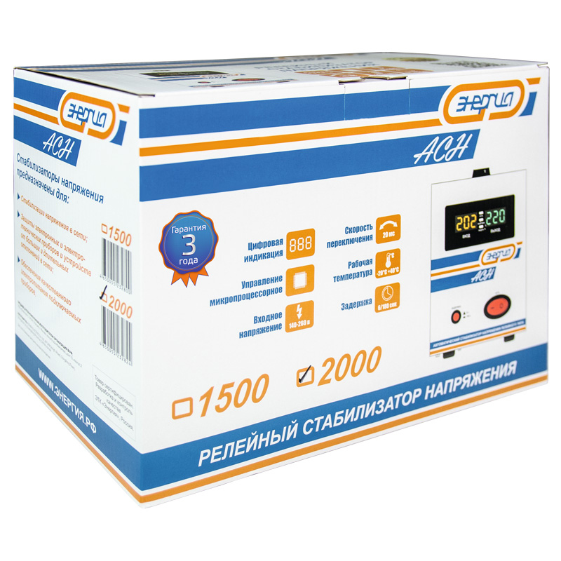 Он обладает такими несомненными достоинствами как компактность и расширенный модельный ряд. Стабилизатор оснащен микропроцессором, обеспечивающим скорость переключения реле в 2–4 раза быстрее других стабилизаторов релейного типа. Блок самотестирования и интеллектуальная программируемая защита значительно повышают надёжность и продлевают срок службы стабилизатора. Мощность стабилизаторов ЭНЕРГИЯ АСН достигает 20 кВа, при этом даже модели большой мощности легко размещаются на небольшом пространстве. Выходное напряжение стабилизатора автоматически поддерживается в диапазоне величин от 207В до 233В, что соответствует требованиям на предельно допустимые значения отклонения напряжения электропитания по ГОСТ 13109-97 «Нормы качества электрической энергии в системах электроснабжения».