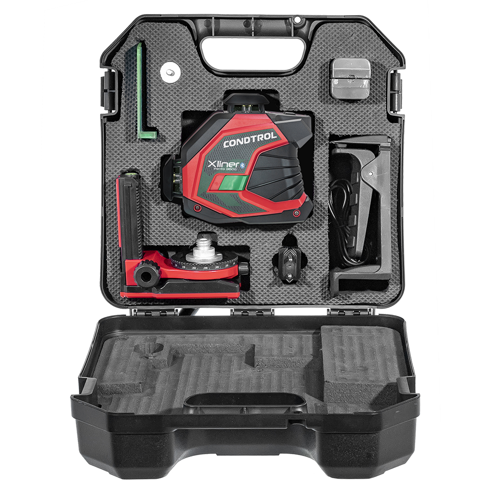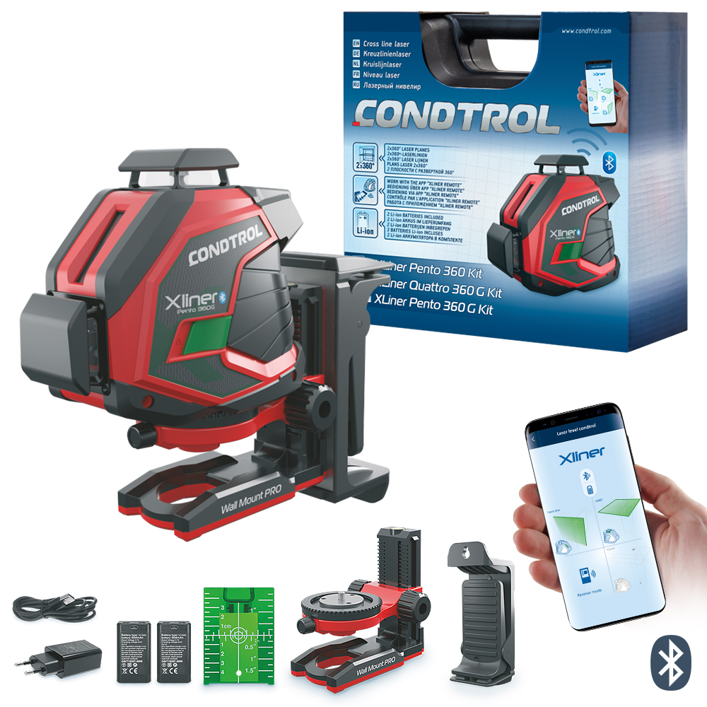 CONDTROL Xliner Pento 360G KitЭто профессиональный расширенный комплект, включающий в себя лазерный нивелир Xliner Pento 360G, настенное крепление Wall Mount pro, крепление-зажим, магнитную мишень, аккумуляторы, руководство по эксплуатации и надежный пластиковый кейс.